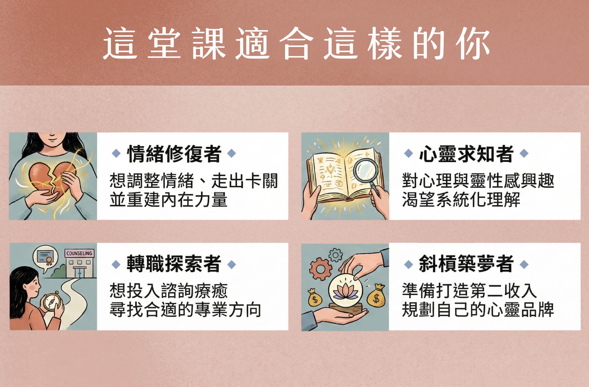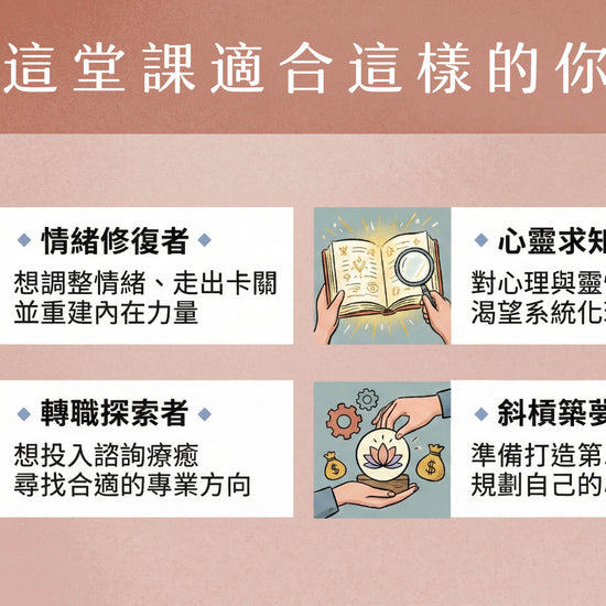 完成課程後,你不只是在照顧自己,也有機會把這份理解與陪伴,延伸成一條能長久發展的道路,為自己也為他人,創造更多可能。